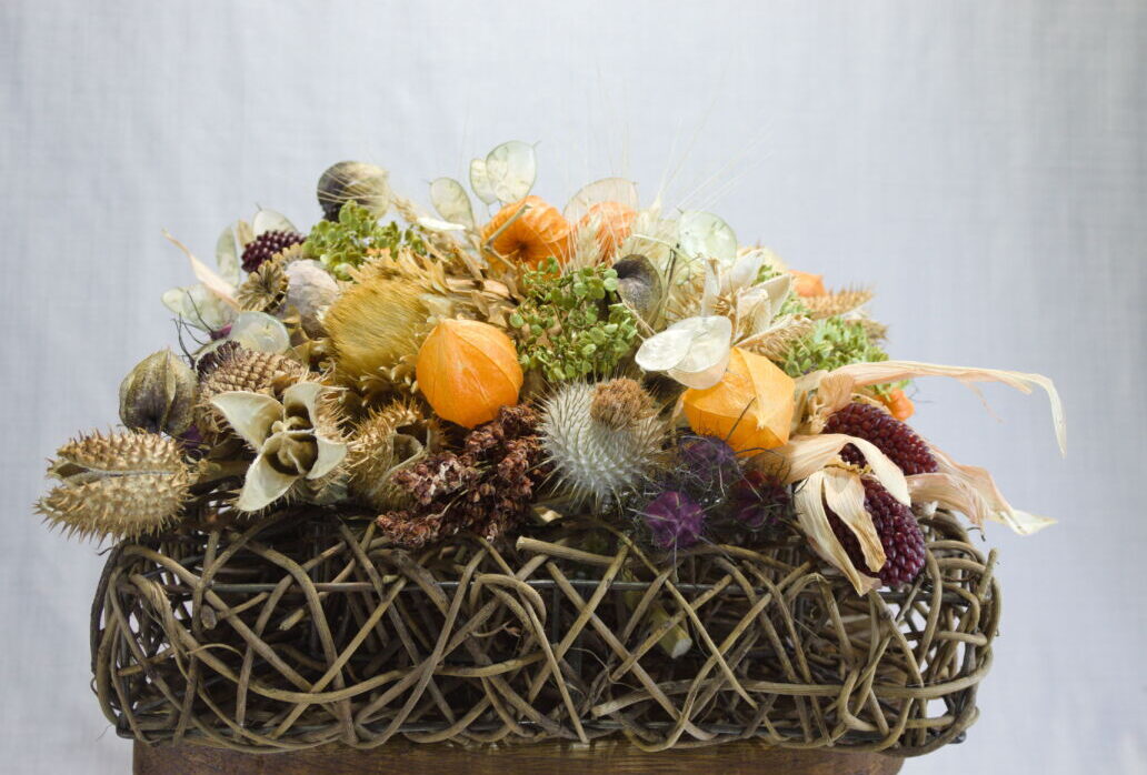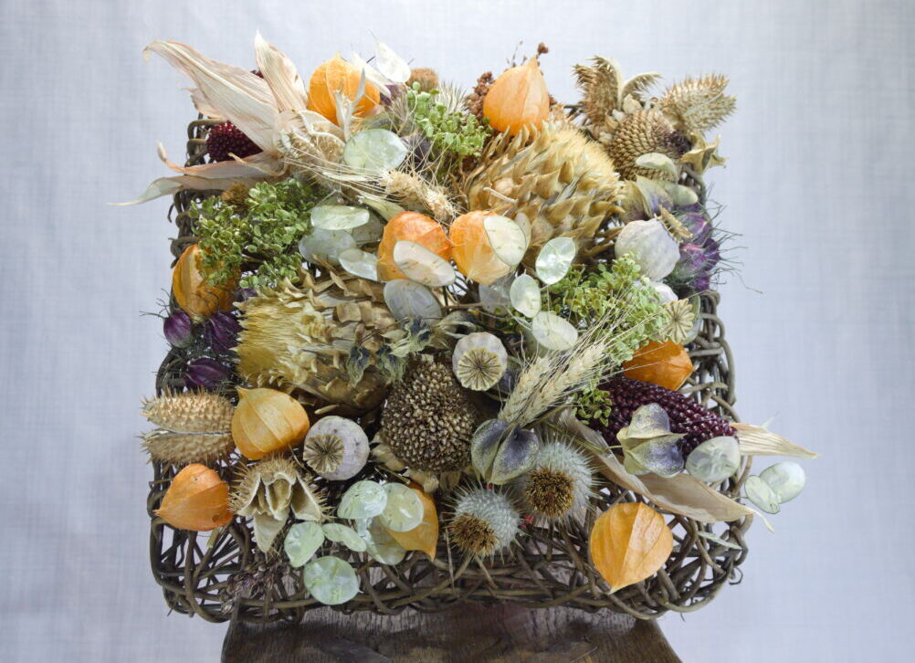 In deze mand vind je gedroogde kardoen, wegdistel, datura, rode mais, Soedangras, rode juffers, lampionnetjes, zegekruid, judaspenning, Engelse tarwe, pastinaak schermen en bolpapaver. Alle vruchten & zaaddozen zijn met liefde gekweekt in onze eigen Second Green kweektuin, zónder het gebruik van schadelijke middelen.